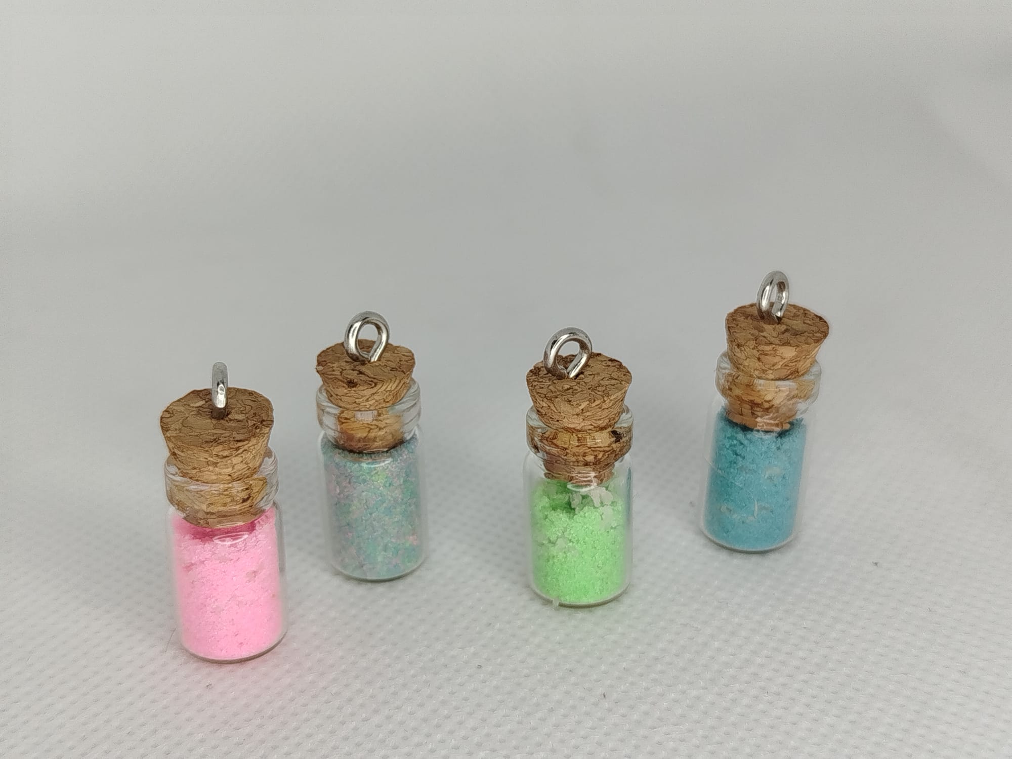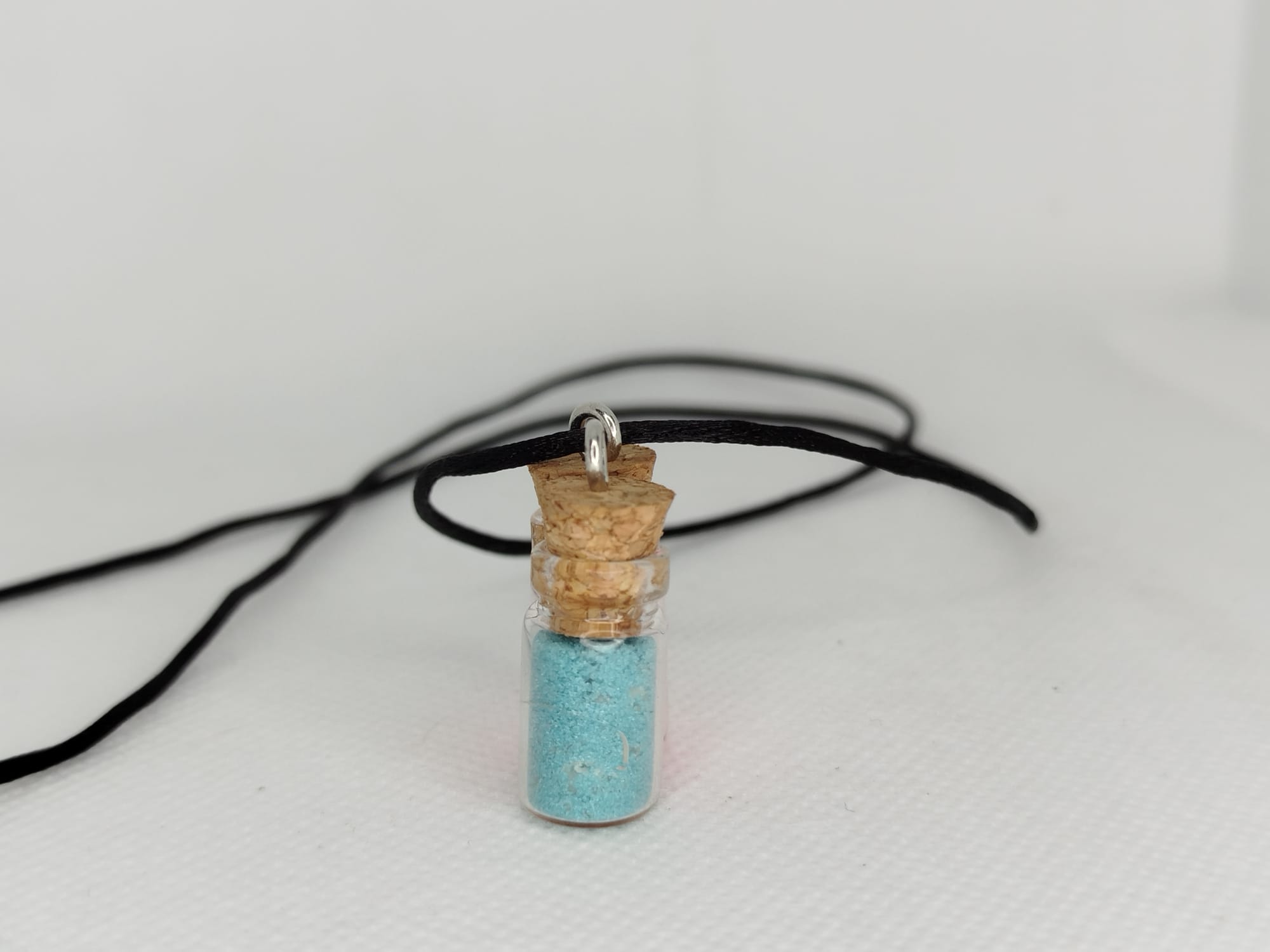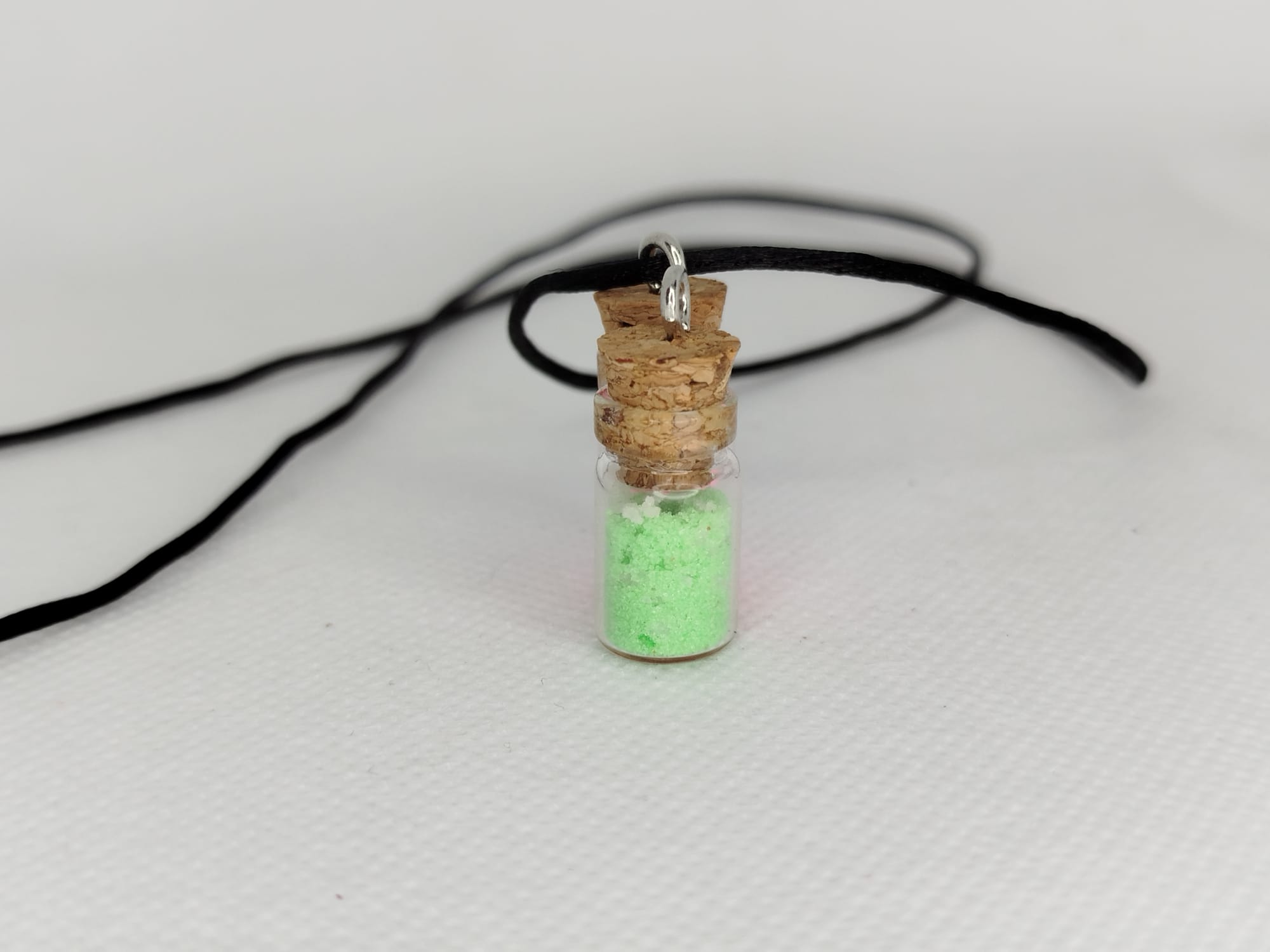 Collar vial con polvo brillante. Este exquisito collar destaca por un diminuto vial relleno de polvo verde brillante, protegido con un delicado corcho. Suspendido de una cuerda negra que le aporta un estilo rústico y cautivador, es el complemento perfecto para agregar un toque mágico y misterioso a cualquier conjunto. El vial mide aproximadamente 3 cm de altura, y la cuerda es ajustable para adaptarse a diferentes longitudes. Ideal para quienes aman lo único y hechizante.