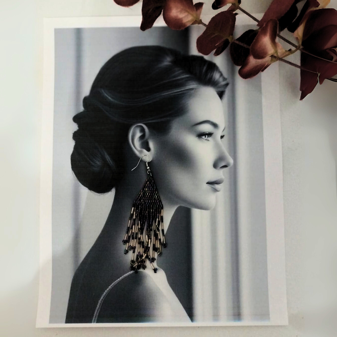 Pendientes de Abalorios: Estos elegantes pendientes están elaborados con un diseño meticuloso de abalorios en tonos oscuros, que aportan un toque de sofisticación a cualquier atuendo. Perfectos tanto para eventos formales como para ocasiones casuales, sus detalles intrincados capturan la luz de manera única. Miden aproximadamente 5 cm de largo y los tonos incluyen negro, azul marino y gris, lo que los convierte en un complemento versátil y atemporal para tu colección de accesorios.