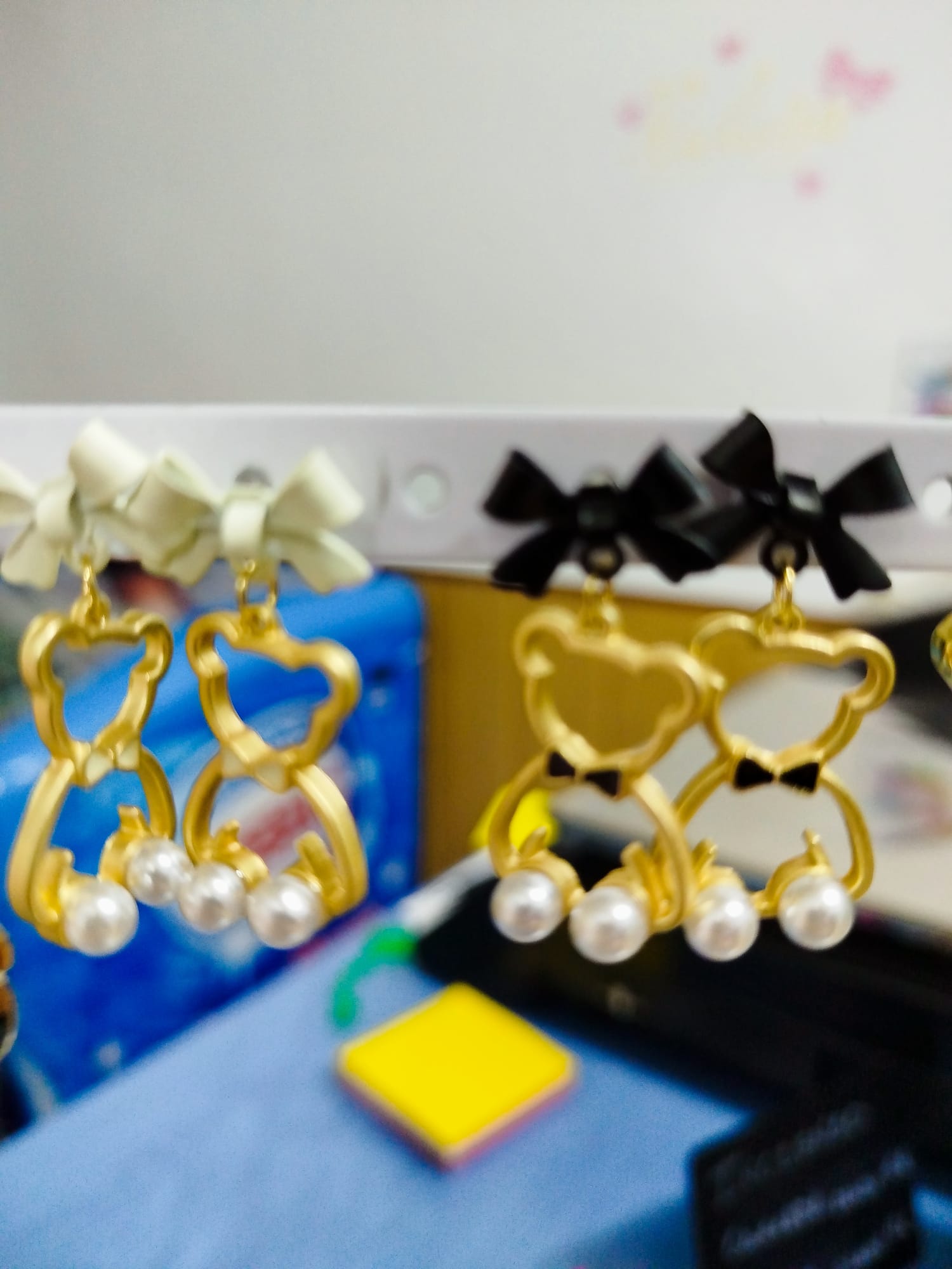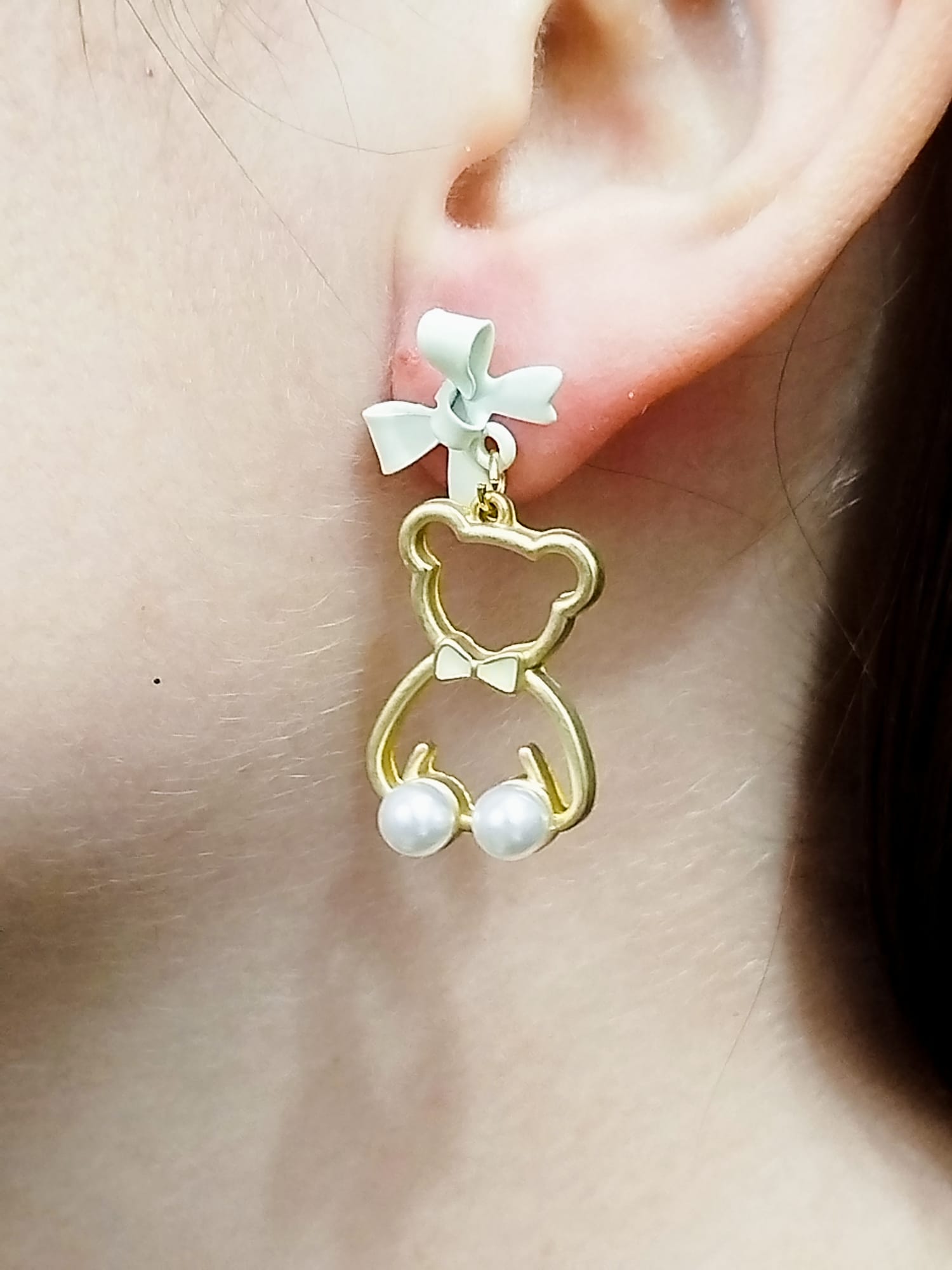 Pendientes dorados con un encantador diseño de osito adornados con colgantes de perlas. Disponibles en dos estilos elegantes, uno con un lazo blanco y otro con un lazo negro. Ideales para añadir un toque de sofisticación y diversión a cualquier conjunto. Cada pendiente mide aproximadamente 3 cm de largo, perfecto para resaltar tu estilo sin ser excesivamente llamativo. Estos pendientes son el accesorio ideal para ocasiones especiales o para darle un toque distintivo a tu look diario.