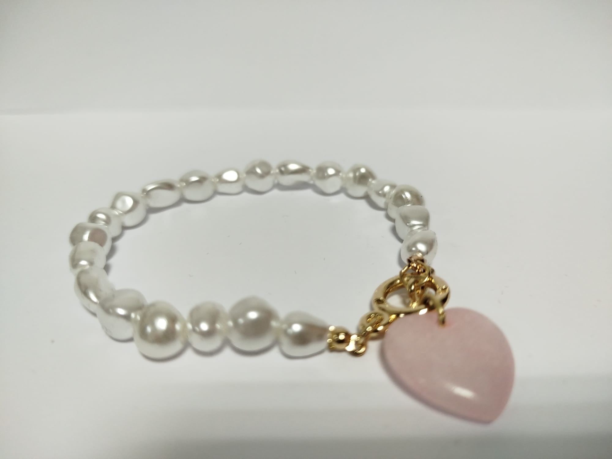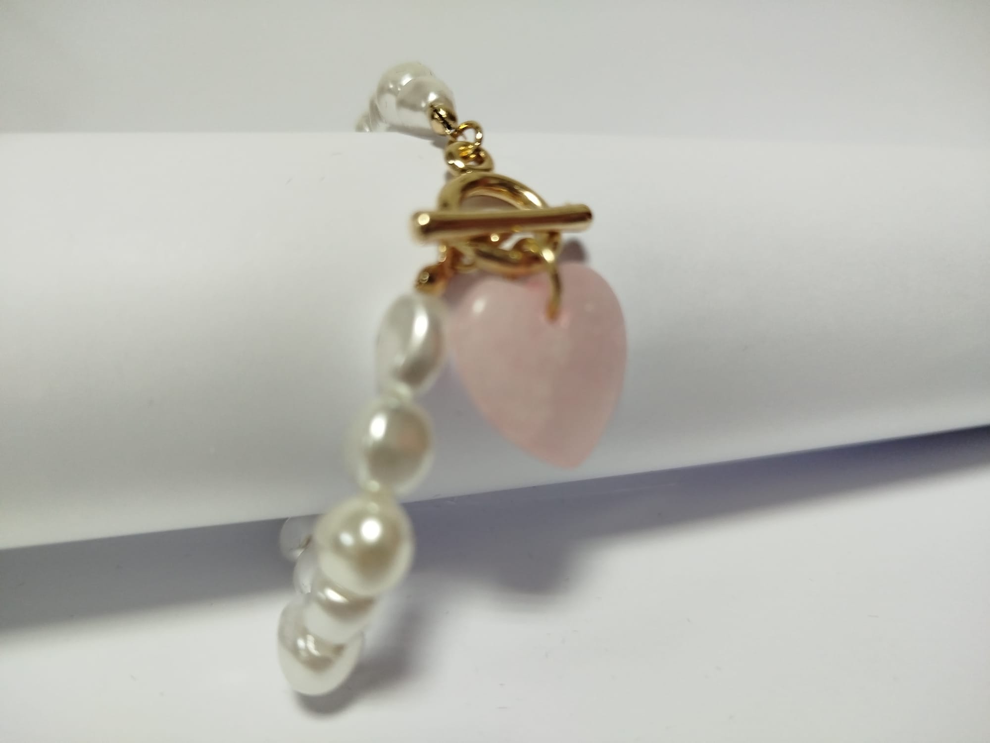 Descubre la elegancia con nuestra pulsera de perlas con colgante de corazón. Elaborada con exquisitas perlas blancas, esta pulsera se embellece con un encantador colgante de cuarzo rosa en forma de corazón. El cierre de barra en tono dorado no solo garantiza seguridad, sino que también aporta un toque de sofisticación y glamour. Ideal para cualquier conjunto, ya sea casual o formal, esta pieza se convierte en el complemento perfecto para resaltar tu estilo. Disponible en un tamaño estándar que se adapta cómodamente a la mayoría de las muñecas.